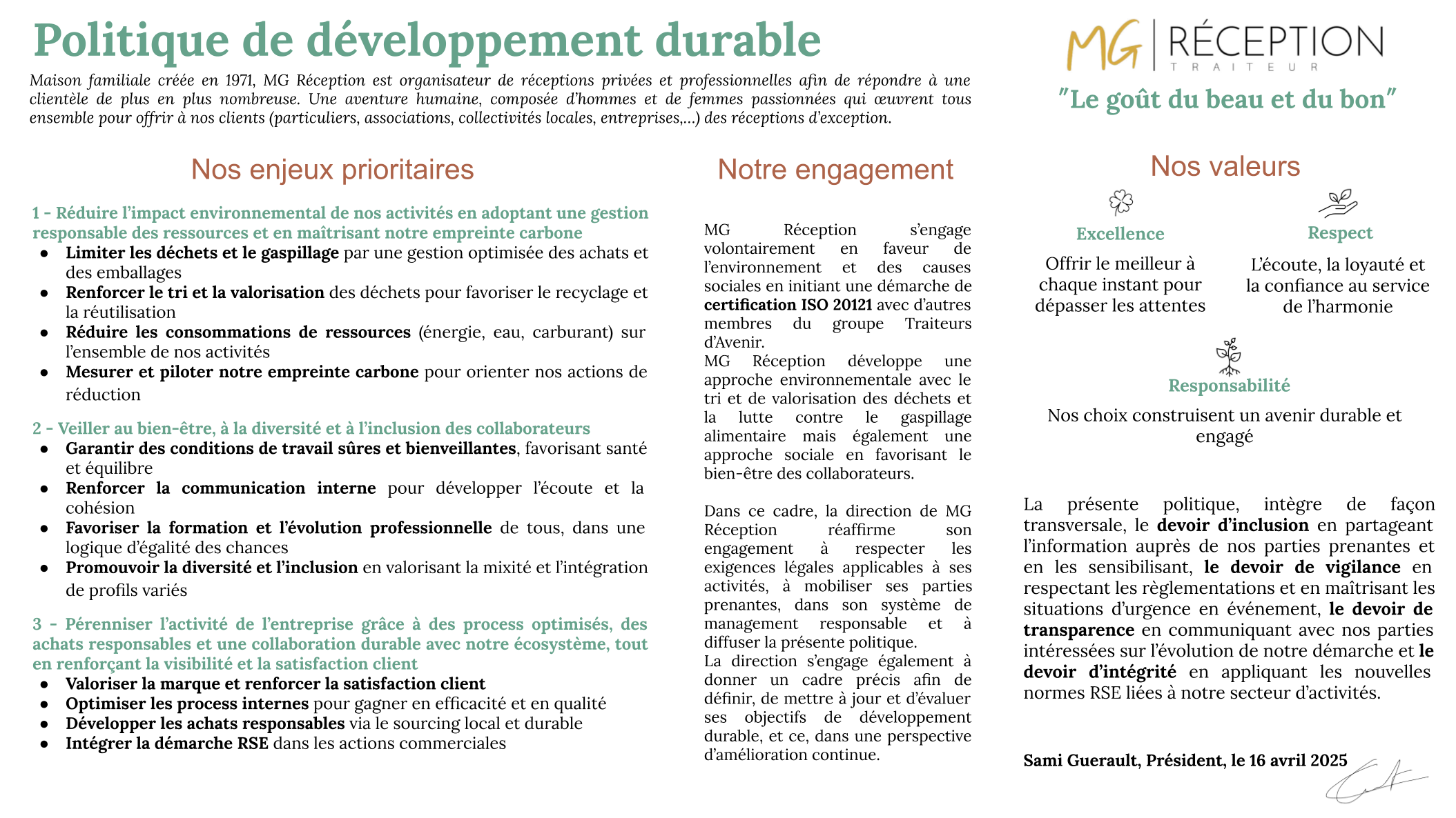 A family house created in 1971, MG Réception organizes private and professional receptions in order to cater to a growing clientele. A human adventure, made up of passionate men and women who all work together to offer our customers (individuals, associations, local authorities, businesses, etc.) exceptional receptions.
